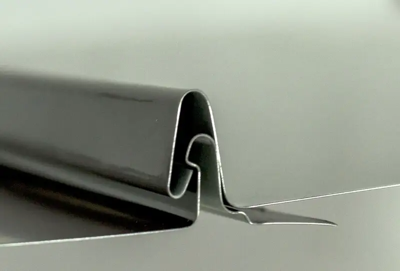 Кликфальц является очень прочным. Две картины скрепляют друг с другом без применения специального инструмента. Замок самозащелкивающийся. Это значительно экономит время монтажа фальцевой кровли.